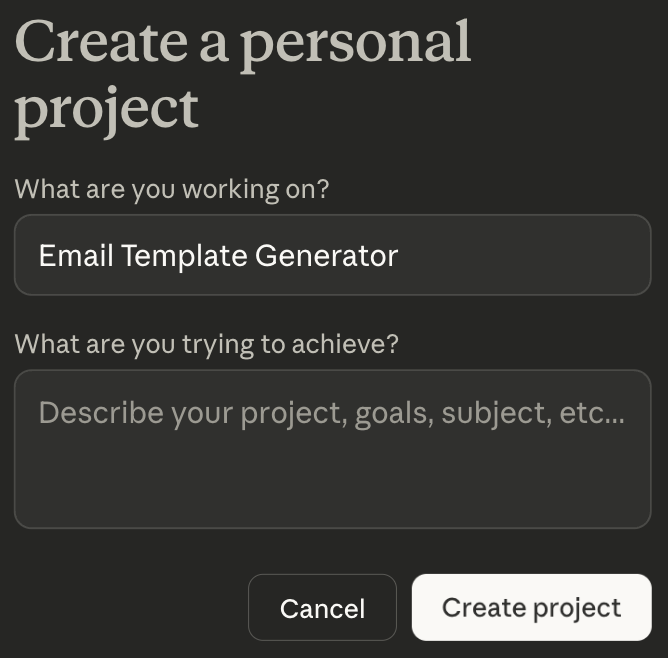 Give your project a clear, descriptive name. “Email Template Generator” works better than “Emails” because you’ll recognize it instantly when switching between projects. The name appears in your dashboard and helps you stay organized when you’re managing multiple workspaces, in the second field you can also add description for project details. (This is just a naming it does not affect or help Claude in any ways)